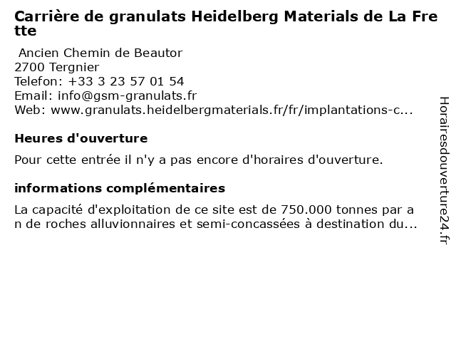 1 Centrale à béton Heidelberg Materials de La Frette (Distance: 0,11 km) Rue de la Frette, 02700 Tergnier béton, centrale, de, frette, heidelberg, la, materials 2 Camping Municipal de la Frette (snack) (Distance: 0,32 km) - Rue de la Prairie, 02700 Tergnier camping, de, frette, hebergement, la, municipal, snack, tourisme 3 Camping Municipal de la Frette (Distance: 0,32 km) - Rue de la Prairie, 02700 Tergnier camping, de, frette, hebergement, la, municipal, tourisme 4 CEMEX Matériaux, Carrière de La Fère (Distance: 3,07 km) Lieu-dit Le Trou Tonnerre, 02800 La Fère carrière, cemex, de, fournisseur de matériel pour le béton, fère, la, matériaux 5 Centrale à béton Heidelberg Materials de Villeneuve-Saint-Germain (Distance: 31,50 km) Rue Jean Baptiste Godin, 02200 Villeneuve-Saint-Germain béton, centrale, de, germain, heidelberg, materials, saint, villeneuve 6 EQIOM Granulats - Carrière (Distance: 33,48 km) - Route départementale 14, 02370 Presles et Boves carrière, constructions, eqiom, fournisseurs, granulats, matériaux, travaux |