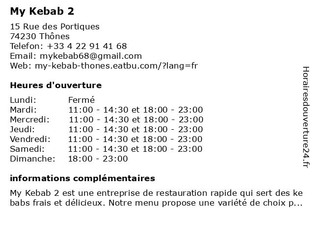| Samedi | 11:00-14:30 et 18:00-23:00 |