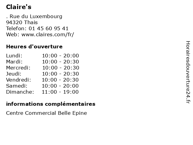 1 Claire's (Distance: 6,56 km) - Avenue du Général de Gaulle, 94000 Creteil accessoires, bijoux, claire's, mode, porter, pret, vetement 2 Claire's (Distance: 8,32 km) 30 Avenue d'Italie, 75013 Paris beaute, bijouterie, boutique, centre, claire's, commercial, fantaisie, jouets 3 Claire's (Distance: 10,39 km) 22 Rue du Départ, 75015 Paris beaute, cafe, chaussures, claire's, enfants, mode femmes, mode hommes, restaurant, sport 4 Claire's (Distance: 11,05 km) 1 Boulevard Saint Michel, 75005 Paris beauté, bijoux, cheveux, claire's, jouets et objets de collection, mode, sacs, technologie 5 Claire's (Distance: 11,48 km) 2 Avenue de l’Europe, 78140 Vélizy-Villacoublay accessoires, bijoux, cadeaux, claire's, montres 6 Claire's (Distance: 11,57 km) 235 Rue Etienne Marcel, 93556 Montreuil accessoires, cafe, chaussures, claire's, hauts, homme, lingerie, mode femme, restaurant |