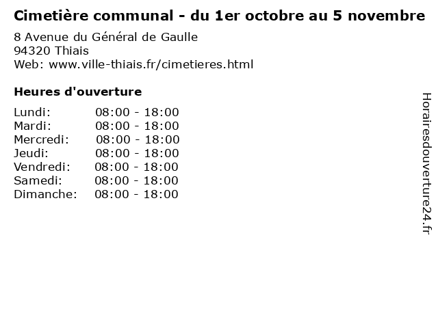 1 Cimetière communal - du 1er avril au 30 septembre (Distance: 0,00 km) 8 Avenue du Général de Gaulle, 94320 Thiais 1er, 30, arbre, au, avril, cimetiere, cimetière, communal, du, espace vert, forêt, funeraire, jardin, loisirs, nature, parc, prairie, septembre, square 2 Cimetière communal - du 16 janvier au 31 mars (Distance: 0,00 km) 8 Avenue du Général de Gaulle, 94320 Thiais 16, 31, arbre, au, cimetiere, cimetière, communal, du, espace vert, forêt, funeraire, janvier, jardin, loisirs, mars, nature, parc, prairie, square 3 Cimetière communal - du 6 novembre au 15 janvier (Distance: 0,00 km) 8 Avenue du Général de Gaulle, 94320 Thiais 15, arbre, au, cimetiere, cimetière, communal, du, espace vert, forêt, funeraire, janvier, jardin, loisirs, nature, novembre, parc, prairie, square 4 Le cimetière Victoire - Du 1er novembre au 1er avril (Distance: 2,30 km) 104 Avenue de la Victoire, 94310 Orly 1er, arbre, au, avril, cimetiere, cimetière, du, espace vert, forêt, funeraire, jardin, le, loisirs, nature, novembre, parc, prairie, square, victoire 5 Le cimetière Victoire - Du 1er avril au 1er novembre (Distance: 2,30 km) 104 Avenue de la Victoire, 94310 Orly 1er, arbre, au, avril, cimetiere, cimetière, du, espace vert, forêt, funeraire, jardin, le, loisirs, nature, novembre, parc, prairie, square, victoire 6 Cimetière Municipal - Hiver (Distance: 6,15 km) 21 Avenue Henri Dunant, 91200 Athis-Mons au, caveau, cimetière, de, dernier, du, défunts, funéraire, février, hiver, jour, municipal, novembre, service |