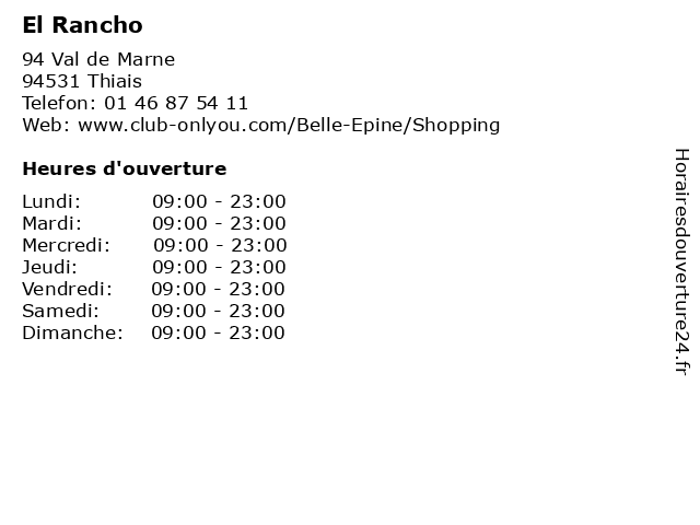 1 El Rancho (Distance: 7,31 km) 30 Avenue d'Italie, 75013 Paris cafe, el, enfants.chaussures, lingerie, mode hemmes, mode homme, rancho, restaurant 2 El Rancho (Distance: 7,45 km) 101 Avenue du Général de Gaulle, 94012 Creteil alimentation, beauté & santé, culture & loisirs, el, enfants, high-tech, maison & déco, mode, rancho, restaurants 4 El Rancho (Distance: 10,17 km) Ctre Cial Regional Velizy, 78140 Velizy Villacoublay france, rancho, restaurants 5 El Rancho (Distance: 10,25 km) 2 Avenue de L'Europe, 78140 Vélizy-Villacoublay centre, commercial, el, micromania, rancho, velizy, villacoublay 6 El Rancho (Distance: 11,86 km) 101 boulevard Jean Jaurès, 92100 Boulogne Billancourt bistrot, el, rancho, restaurant |
