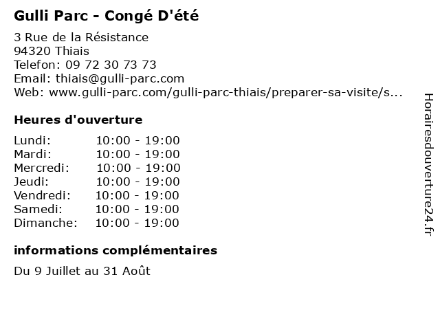1 Gulli Parc - Congé D'été (Distance: 12,85 km) 5 Rue de la Croix Saint-Jacques, 91620 La ville-du-Bois activité extérieur, attractions, congé, d'été, enfants, gulli, jeux, loisirs, parc, sorties 2 Gulli Parc - Congé Scolaire (hors été) (Distance: 0,00 km) 3 Rue de la Résistance, 94320 Thiais activité extérieur, attractions, congé, enfants, gulli, hors, jeux, loisirs, parc, scolaire, sorties, été 3 Gulli Parc - Période Scolaire (Distance: 0,00 km) 3 Rue de la Résistance, 94320 Thiais activité extérieur, attractions, enfants, gulli, jeux, loisirs, parc, période, scolaire, sorties 4 Yespark, location de parking au mois - Centre-ville/Parc Prairie/Hautes Bornes - Choisy-le-Roi (Distance: 1,64 km) 37-39 Avenue Rosa Luxemburg, 94600 Choisy-le-Roi au, bornes, centre, choisy, de, le, location, mois, parking, prairie/hautes, roi, ville/parc, yespark 5 École élémentaire publique Le Parc (Distance: 1,78 km) 23 Paul Carle, 94600 Choisy-le-Roi ecole, education, le, parc, publique, services, école, élémentaire 6 Médiathèque Boris Vian - Vacances d'été (Distance: 2,45 km) 25 Avenue du Président Franklin Roosevelt, 94550 Chevilly Larue boris, cd audio, cd.rom, d'été, horaires, livres, mediatheque, médiathèque, revues, vacances, vian |