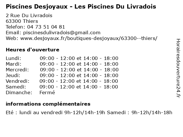 1 Livradois Forez Etanchéité - LFE 63 (Distance: 11,21 km) 12 Rue de Valette, 63120 Courpière 63, courpière, etanchéité, forez, géomembrane, géosynthétique, lfe, lfe 63, livradois, sols, étanchéité 2 Tuyauterie Chaudronnerie Pneumatique du Livradois TCPL (Distance: 11,21 km) 12 Rue de Valette, 63120 Courpière chaudronnerie, du, livradois, pneumatique, tcpl, tuyauterie 4 Piscine à Thiers - Vacances scolaires (hors vacances d'été) (Distance: 0,65 km) - avenue Jean Jaures, 63300 Thiers d'été, hors, natation sportive, piscine, scolaires, sportif, thiers, vacances 5 Piscine à Thiers - Vacances d'été (Distance: 0,65 km) - avenue Jean Jaures, 63300 Thiers d'été, natation sportive, piscine, sportif, thiers, vacances 6 Oasis Piscines et Spas (Distance: 25,23 km) . route d'Ennezat, 63720 Chappes entretien, et, installation, location, oasis, piscines, pisciniste, spas |