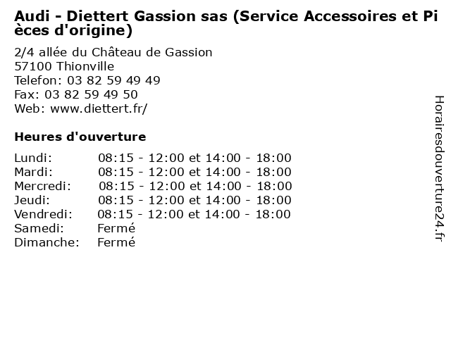 1 Audi - Diettert Gassion sas ( Service Carrosserie) (Distance: 0,00 km) 2/4 allée du Château de Gassion, 57100 Thionville audi, carrosserie, diettert, gassion, sas, service, services, véhicules 2 Audi - Diettert A31 sas (Service Commercial) (Distance: 0,83 km) 35 rue Laydecker, 57100 Thionville a31, audi, commercial, diettert, sas, service, services, véhicules 4 Restauration Du Soleil Sas (Distance: 1,97 km) 21 Rue De Jemmapes, 57100 Thionville restaurants, restauration, soleil 5 Invicta Shop - SAS KUBE Multiservices (Distance: 2,43 km) 40 Boucle du Ferronnier, 57180 Terville bois, chauffage, cheminée, feu, granulé, invicta, kube, multiservices, sas, shop 6 V.Scheil SAS - Dépannage de chaudière (Distance: 4,37 km) 2 Rue Henry Bessemer, 57970 Yutz chaudière, chauffage, cuves, de, dépannage, fioul, gaz, nettoyage, ramonage, sas, scheil, v.scheil, victor, yutz |