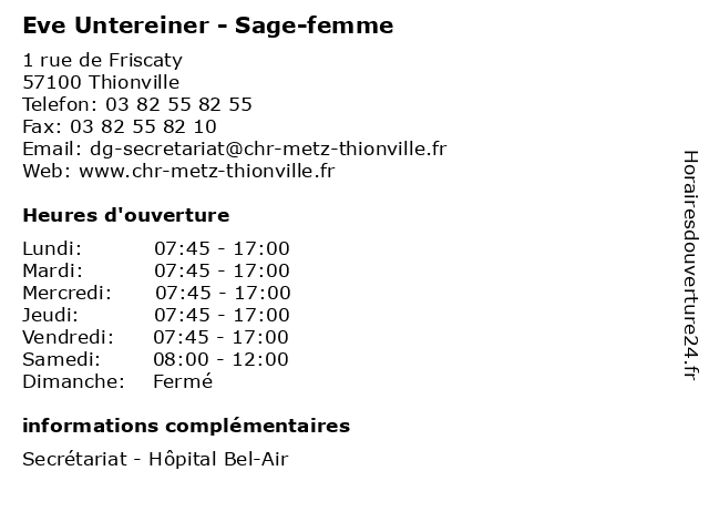 1 Dr Patrick Saint-Eve - Chirurgien général (Distance: 0,00 km) 1 rue de Friscaty, 57100 Thionville chirurgien, consultation, docteur, dr, eve, général, med, medecine, medical, médecin, patrick, saint, traitement 2 Eve Terver - Sage-femme (Distance: 0,00 km) 1 rue de Friscaty, 57100 Thionville consultation, docteur, eve, femme, med, medecine, medical, médecin, sage, terver, traitement 3 Dr Marie-Elisabeth Saint-Eve - Rhumatologue (Distance: 1,91 km) 26 Avenue Clemenceau, 57100 Thionville dr, elisabeth, eve, marie, rhumatisme, rhumatologue, saint, sante, soins 6 |