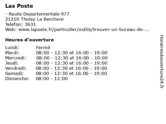 1 La Poste (Distance: 6,59 km) 4 Place Des Tilleuils, 21430 Censerey agence postale, courrier postal, expédition internationale, la, poste 2 La Poste (Distance: 13,74 km) 1 Place de la Mairie, 21320 Essey agence postale, courrier postal, expédition internationale, la, poste 3 La Poste (Distance: 14,85 km) 7 Place de l'Abbé Poulot, 21430 Manlay agence postale, courrier postal, expédition internationale, la, poste 4 La Poste (Distance: 28,41 km) - Avenue Francois Mitterrand, 58230 Planchez agence postale, courrier postal, expédition internationale, la, poste 5 La Poste (Distance: 36,97 km) 15 Place De L Eglise, 89200 Magny agence postale, courrier postal, expédition internationale, la, poste 6 La Poste (Distance: 46,84 km) 47 Grande Rue, 89200 Lucy Le Bois agence postale, courrier postal, expédition internationale, la, poste |
