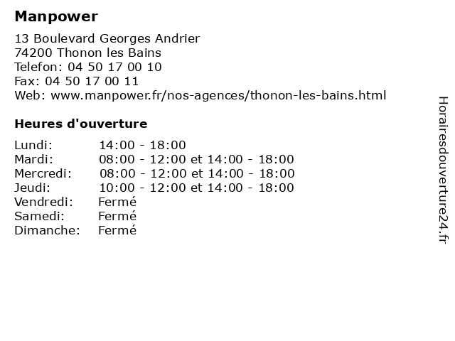 1 Agence d'Intérim Manpower Thonon-les-Bains (Distance: 0,01 km) 13 Boulevard Georges Andrier, 74200 Thonon-les-Bains agence, agence de recrutement, agence intérim, agence pour l'emploi, bains, cabinet de recrutement, cdi, d'intérim, intérim, les, manpower, recrutement, thonon 3 Manpower (Distance: 33,04 km) 92 Place de l'Hôtel de Ville, 74130 Bonneville agence, d'intérim, manpower 4 Manpower (Distance: 33,97 km) 1427 Avenue Georges Clemenceau, 74300 Cluses agence, d'intérim, manpower 5 Agence d'Intérim Manpower Morez (Distance: 39,11 km) 113 Rue de la République, 39400 Hauts-de-Bienne agence, agence de recrutement, agence intérim, agence pour l'emploi, cabinet de recrutement, cdi, d'intérim, intérim, manpower, morez, recrutement 6 Manpower (Distance: 47,95 km) 27 Rue Carnot, 39200 Saint Claude emploi, manpower, recrutement, services |