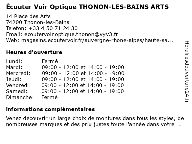 1 Onepark / Parc des Arts Parking (Distance: 0,09 km) 10 Place des Arts, 74200 Thonon arts, des, onepark, parc, parking, services 2 Parking Indigo Thonon-les-Bains Les arts (Distance: 0,10 km) Place Des Arts, 74200 Thonon-les-Bains arts, bains, borne de recharge pour véhicules électriques, indigo, les, parking, thonon 3 Ecole Maternelle Publique Les Arts (Distance: 0,17 km) . Square Jean Monnet, 74200 Thonon-les-Bains arts, cours, ecole, education, les, maternelle, publique, services, école 4 Écouter Voir Optique THONON-LES-BAINS HOTEL DIEU (Distance: 0,25 km) Place Jules Mercier, 74200 Thonon-les-Bains bains, dieu, hotel, les, optique, thonon, voir, écouter 5 Écouter Voir Audition THONON-LES-BAINS VALLON (Distance: 0,26 km) 3 Rue de l'Hôtel Dieu, 74200 Thonon-les-Bains audition, bains, les, thonon, vallon, voir, écouter 6 Optique Brand (Distance: 0,26 km) 1 Avenue du Général de Gaulle, 74200 Thonon-les-Bains brand, optique |