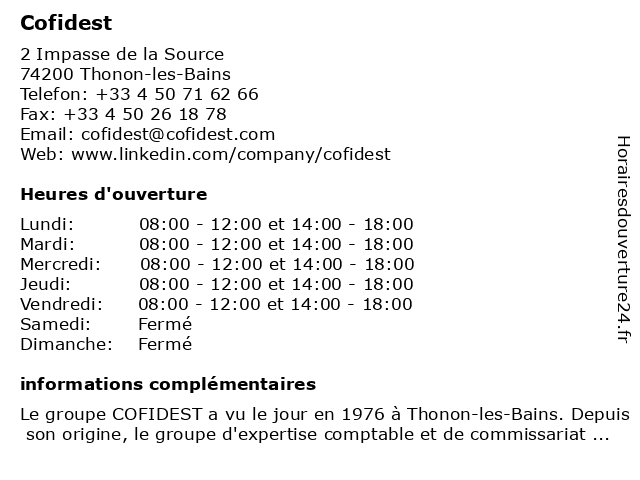 1 Cofidest Genevois SARL (Distance: 24,14 km) 20 Rue des Enfants du Monde, 74100 Ville-la-Grand cofidest, genevois, sarl 3 Cofidest Sallanches (Distance: 46,58 km) 1431 Avenue André Lasquin, 74700 Sallanches cofidest, sallanches |