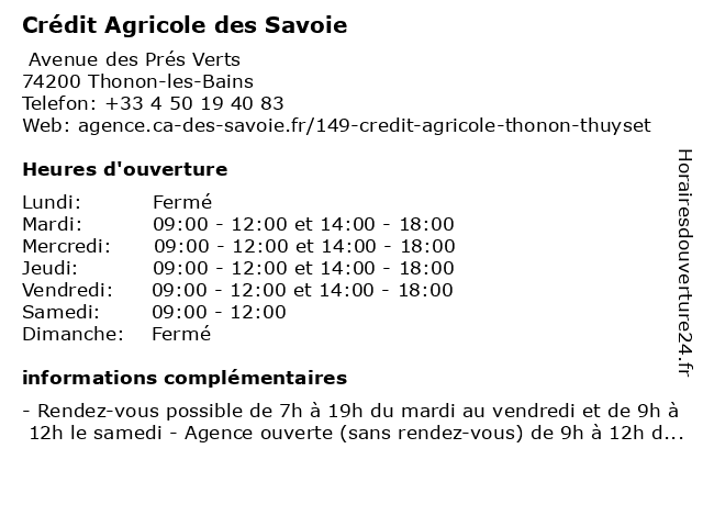 1 Crédit Agricole des Savoie (Distance: 1,25 km) 2 Avenue Saint-François de Sales, 74200 Thonon-les-Bains agricole, crédit, des, savoie 2 Crédit Agricole des Savoie (Distance: 1,76 km) 10 Place Jules Mercier, 74200 Thonon-les-Bains agricole, crédit, des, savoie 3 Crédit Agricole des Savoie (Distance: 3,56 km) 19 Chemin d'Hirmentaz, 74200 Thonon-les-Bains agricole, crédit, des, savoie 4 Crédit Agricole des Savoie (Distance: 3,86 km) Avenue de la Rive, 74500 Publier agricole, crédit, des, savoie 5 Crédit Agricole des Savoie (Distance: 7,53 km) 68 Quai Charles-Albert Besson, 74500 Évian-les-Bains agricole, crédit, des, savoie 6 Crédit Agricole des Savoie (Distance: 10,45 km) 251 Route du Chablais, 74500 Saint-Paul-en-Chablais agricole, crédit, des, savoie |