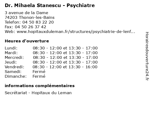 1 Dr Philippe Denneulin - Psychiatre (Distance: 0,00 km) 3 avenue de la Dame, 74203 Thonon-les-Bains consultation, denneulin, docteur, dr, med, médecin, médecine, philippe, psychiatre, traitement 2 Dr Pierre Meyer - Psychiatre (Distance: 1,46 km) 7 Rue de Lort, 74200 Thonon-les-Bains dr, folie, meyer, pierre, psychiatre, psychiatrie, psychiatrique 3 Dr Bogdan Stanescu - Psychiatre (Distance: 9,70 km) 22 Avenus des Sources, 74500 Évian-les-Bains bogdan, dr, folie, psychiatre, psychiatrie, psychiatrique, stanescu 4 Dr Mihaela Buboi - Ophtalmologue (Distance: 57,52 km) 159 Route de closon, 74330 Poisy buboi, docteur, dr, generaliste, medical, mihaela, ophtalmologue, soin 5 Nais Armitano - Psychologue (Distance: 14,77 km) 17 Avenue du Bas Chablais, 74140 Douvaine armitano, folie, nais, psychiatre, psychiatrie, psychiatrique, psychologue 6 Audrey Chappuis - Psychologue (Distance: 23,86 km) 7 Rue de la Corne d'Abondance, 74100 Ville-la-Grand audrey, chappuis, folie, psychiatre, psychiatrie, psychiatrique, psychologue |