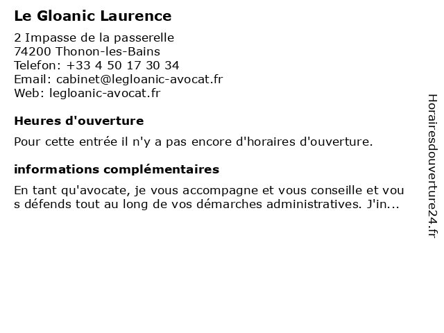 | 1 Maître Laurence Rouget - Avocate (Distance: 0,51 km) 4 Place de l'Hôtel de Ville, 74200 Thonon-les-Bains avocate, avocats, civils, droits, juridiques, laurence, maître, rouget 2 Laurence Blondelle - Sage-femme (Distance: 3,56 km) 35bis Route de Corzent, 74200 Anthy-sur-Léman blondelle, femme, laurence, medical, sage, sagefemme 3 Chessel Bel Laurence (Distance: 15,06 km) Fontany , 74360 Vacheresse bel, chessel, laurence, restaurants 4 Perret-Jeanneret Robin Laurence (Distance: 24,29 km) 2135 Route De Taninges, 74110 La Cote D Arbroz jeanneret, laurence, perret, restaurants, robin 5 Moenne-Loccoz Rebillard Laurence (Distance: 35,14 km) Pl De La Mairie, 74440 Morillon laurence, loccoz, moenne, rebillard, restaurants 6 Berod Deturche Christine Laurence (Distance: 36,27 km) 270 Avenue De La Gare, 74800 La Roche Sur Foron berod, boucheries, christine, deturche, laurence, poissonneries |