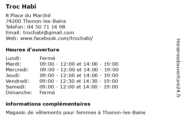 1 Troc (Distance: 3,93 km) . Route de Margencel, 74200 Anthy sur leman deco, electro, loisirs, meubles, troc 2 Troc.com Annemasse - Ville La Grand (Distance: 24,00 km) 36 Rue de Montréal, 74100 Ville-la-Grand annemasse, grand, la, troc.com, ville 5 Troc Sport (Distance: 59,22 km) 1 Rue de l'Egalité, 74960 Meythet glisse, magasins, ski, sport, troc, équipement 6 Trésors de Filles - 13ors2filles (Distance: 0,01 km) 7 Place du Marché, 74200 Thonon-les-Bains 13ors2filles, accessoires, boutique, de, filles, mode, tresors, trésors, vêtements |