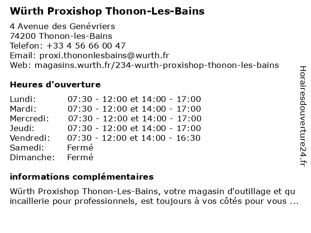 1 Würth Proxishop Annemasse (Distance: 27,44 km) 2 Rue des Artisans, 74100 Ville-la-Grand annemasse, proxishop, würth 2 Würth Proxishop Cluses (Distance: 36,32 km) 520 Avenue des Lacs, 74950 Scionzier cluses, proxishop, würth 3 Würth Proxishop Sallanches (Distance: 49,88 km) 1431 Avenue André Lasquin, 74700 Sallanches proxishop, sallanches, würth 4 Würth Proxishop Pontarlier (Distance: 58,39 km) 15 Rue Pierre Dechanet, 25300 Pontarlier pontarlier, proxishop, würth |