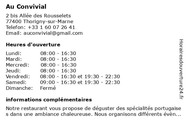 1 Restaurant Au Convivial - Le Bar (Distance: 0,01 km) 2 bis allée des Rousselets, 77400 Thorigny sur Marne au, bar, convivial, cuisine, le, portugaise, restaurant, traditionnelle 2 Bistrot de La Place (Distance: 26,11 km) 2 Place du Marché Sainte-Catherine, 75004 Paris bistrot, café, convivial, de, français, la, place, traditionnel 3 Le Convivial (Distance: 26,54 km) 3 Avenue De Valenton, 94190 Villeneuve Saint Georges allah, amanato, convivial, restaurants, tahri 4 Le Convivial (Distance: 28,14 km) 137 Boulevard Auguste Blanqui, 75013 Paris boissons, convivial, cuisine, le, menus, repas, restaurants 5 Le Sancerre (Distance: 28,44 km) 25 Rue Claude Warocquier, 95410 Groslay bar, café, convivial, détente, le, restaurant, sancerre 6 Résidence Villa Garlande - emeis (Distance: 32,06 km) 16 Avenue de Garlande, 92220 Bagneux activités, alzheimer, ateliers thérapeutiques, autonomie, bagneux, bien-être, chambre, confort, convivial, ehpad, emeis, garlande, hôtelier, maison de retraite, médicalisée, personnes âgées, qualité, restauration, résidence, senior, soin, unité de soins adaptés, villa, équipe |