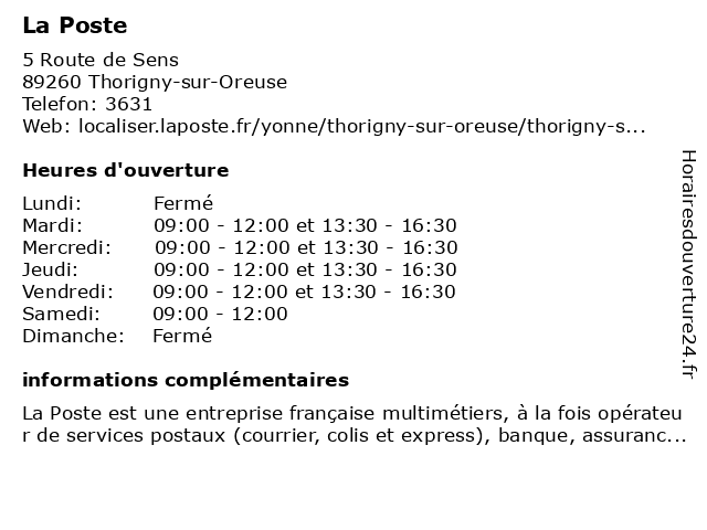 1 La Poste (Distance: 4,52 km) 28 Bis Grande Rue, 89260 Voisines agence postale, courrier postal, expédition internationale, la, poste 2 La Poste (Distance: 7,40 km) 23 Rue de la Mairie, 89100 Soucy express chronopost, la, poste, réexpédition internationale 3 La Poste (Distance: 11,43 km) 2 rue de Beaulieu, 89190 Courgenay agence, colis, courriers, expédition, la, postale, poste, relais 4 La Poste (Distance: 12,37 km) 38 Rue Charles de Gaulle, 89140 Michery agence, colis, courriers, expédition, la, postale, poste, relais 5 La Poste (Distance: 12,99 km) 18 Rue de l'Église, 89100 Courtois-sur-Yonne agence, colis, courriers, expédition, la, postale, poste, relais 6 La Poste (Distance: 13,29 km) 23 Rue Saint-Martin, 77480 Fontaine-Fourches express chronopost, la, poste, réexpédition internationale |