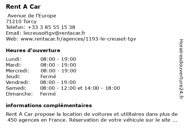 1 Rent A Car (Distance: 17,26 km) Rue des Chavannes, 71300 Montceau-les-Mines agence de location de véhicules, aller simple, car, location d'utilitaires, location de voitures, location de véhicules, rent, voitures sans permis 2 National Car Rental - Gare du Creusot TGV (Distance: 0,10 km) Le Creusot Tgv Technolpole Cor, 71210 Torcy car, creusot, du, gare, national, rental, tgv 3 Alamo - Enterprise Rent-A-Car (Distance: 0,17 km) - Rue d'Alembert, 71210 Torcy agence, alamo, car, enterprise, location, rent, utilitaire, voiture, véhicule 4 Aire Municipale et Euro-Relais (Borne campings-car) (Distance: 2,64 km) - route du Bourg, 71000 Ecuisses aire, borne, camping, campings, car, eau, et, euro, municipale, relais, service, stationnement, tourisme, vidange 5 CAR.KUSTOM (Distance: 3,18 km) 46 Rue des Goulottes, 71210 Torcy car.kustom, customisation de voitures, décoration de carrosseries, entreprise de covering en saône-et-loire, pose de stickers, pose de vitres teintées 6 Aire Municipale et Euro-Relais (Borne campings-car) (Distance: 4,72 km) - Route de Marigny, 71210 Saint-Eusèbe aire, borne, camping, campings, car, et, euro, municipale, relais, repos, service, stationnement, tourisme, vidange |