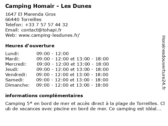 1 Camping Les Dunes (Distance: 0,02 km) - Voie de Barcelone, 66440 Torreilles Plage camping, dunes, hebergement, les, tourisme 2 Camping Les Dunes - Réception (basse saison) (Distance: 0,23 km) - Voie de Barcelone, 66440 Torreilles Plage basse, camping, dunes, hebergement, les, réception, saison, tourisme 3 Camping Les Dunes - Réception (haute saison) (Distance: 0,23 km) - Voie de Barcelone, 66440 Torreilles Plage camping, dunes, haute, hebergement, les, réception, saison, tourisme 4 Camping Marisol (Distance: 0,43 km) - Boulevard de la Plage, 66440 Torreilles camping, hebergement, marisol, tourisme 5 Camping l'Oasis (Réception) (Distance: 1,67 km) - Route de Saint-Laurent, 66420 Le Barcarès camping, hebergement, l'oasis, réception, tourisme 6 Camping Le Sainte Marie (Distance: 5,72 km) - Chemin des Clauses, 66470 Sainte Marie la Mer camping, hebergement, le, marie, sainte, tourisme |