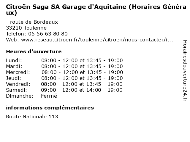 Termes de recherche pour Citroën Saga SA Garage d'Aquitaine (Horaires Généraux):garage, horaires, sa, services, saga, véhicules, citroen, généraux, d'aquitaine, horaries |