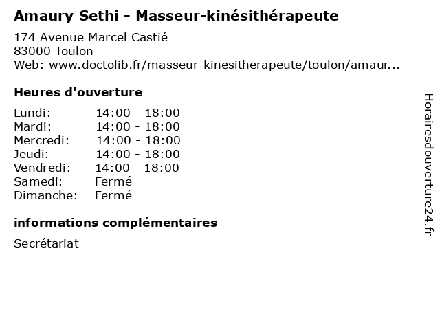 1 Amaury Bruneau (Distance: 15,72 km) 6 rue Georges Simenon, 83400 Hyeres amaury, amaury bruneau, bruneau, crise d'angoisse, crise de panique, sophrologue, thérapeute 2 Boucherie Amaury Antoine (Distance: 27,02 km) 3 Place Léopold Cupif, 13600 Ceyreste amaury, antoine, boucherie 3 Dr Amaury Estebe - Chirurgien-dentiste (Distance: 47,82 km) 393 Avenue du Prado, 13008 Marseille amaury, chirurgien, consultation, dentiste, docteur, dr, estebe, med, médecin, médecine, secrétariat, traitement 4 Dr Amaury Grandjean - Chirurgien orthopédiste et traumatologue (Distance: 58,88 km) 930 Avenue Fortuné Ferrini, 13080 Aix-en-Provence amaury, chirurgien, dr, et, grandjean, orthopedie, orthopédique, orthopédiste, trauma, traumatologie, traumatologique, traumatologue 5 Dr Amaury De Cassin - Médecin généraliste (Distance: 59,76 km) 15 Rue Maréchal Joffre, 13100 Aix-en-Provence amaury, cassin, de, docteur, dr, generaliste, généraliste, medecin, médecin, soins 6 Sylvia Josselin - Masseur-kinésithérapeute (Distance: 0,00 km) 174 Avenue Marcel Castié, 83000 Toulon josselin, kiné, kinésithérapeute, masseur, rééducation, soin, sylvia |