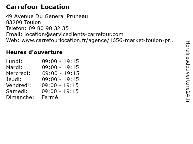 1 Carrefour Location (Distance: 5,26 km) - Avenue de l'Université, 83160 La Valette-du-Var carrefour, location, services, utilitaires, vehicules 2 Carrefour Location (Distance: 6,21 km) 55 Chemin de la Bouyere, 83190 Ollioules bébé, carrefour, cosmétique, diététique, location, parapharmacie 3 Carrefour Location (Distance: 10,38 km) - avenue de la Mer, 83140 Six Fours les Plages alimentation, carrefour, location, magasin discount, market, supermarché 4 Carrefour Location (Distance: 12,17 km) - ZI Le Patrimoine, 83260 La Crau agence, carrefour, location, utilitaires, véhicules 5 Carrefour Location (Distance: 17,65 km) . quartier de la Guarduère, 83150 Bandol carrefour, location, trajet, utilitaire, véhicule 6 Carrefour Drive (Distance: 0,04 km) 459 Avenue Du General Pruneau, 83200 Toulon alimentaire, carrefour, courses, drive, en ligne, magasin |