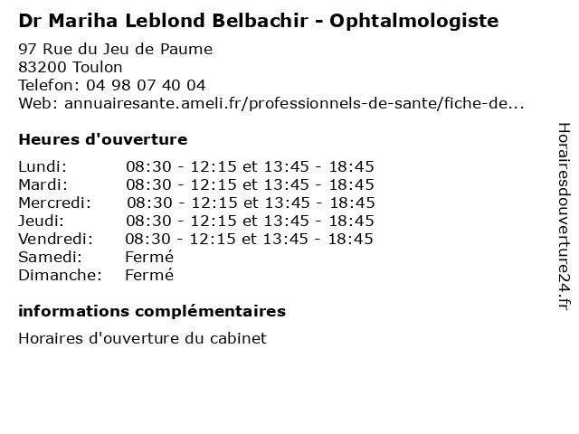 | Lundi | 08:30-12:15 et 13:45-18:45 |
