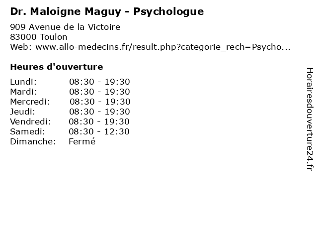 2 Hôtel de France Maguy (Distance: 33,39 km) . Avenue du Revestel, 13260 Cassis bar, de, france, hotel, hôtel, maguy, restaurant, service 3 Hélène Faltermeier - Pédicure-podologue (Distance: 0,01 km) 909 Avenue de la Victoire du 8 Mai 1945, 83000 Toulon faltermeier, hélène, pedicure, pied, podologue, pédicure, sante 4 Medecin Valerie Bataller (Médecin généraliste) (Distance: 0,10 km) 54 Allee des Lices, 83000 Toulon bataller, docteur, généraliste, medecin, médecin, sante, services, valerie 5 Agnès Chamorey - Psychologue (Distance: 0,49 km) 401 Avenue de la Victoire du 8 Mai 1945, 83000 Toulon agnès, chamorey, psychanalyste, psychologue, psychothérapeute, thérapie 6 Emmanuelle Soulas - Psychologue (Distance: 0,61 km) 500 Boulevard de Tessé, 83000 Toulon emmanuelle, folie, psychiatre, psychiatrie, psychiatrique, psychologue, soulas |