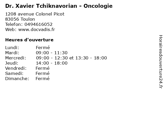 1 Dr. Jean Pierre Esterni - Oncologie (Distance: 0,00 km) 1208 avenue Colonel Picot, 83056 Toulon consultation, docteur, dr., esterni, jean, oncologie, pierre, santé 2 Centre Hospitalier Intercommunal de Toulon / Oncologie et Hématologie (secrétariat) (Distance: 0,00 km) 1208 Avenue Colonel Picot, 83056 Toulon centre, consultation, de, docteur, et, hospitalier, hématologie, intercommunal, médecins, oncologie, santé, secrétariat, toulon 3 Chits Toulon La Seyne - Oncologie (secrétariat ) (Distance: 0,00 km) 1208 avenue Colonel Picot, 83056 Toulon chits, consultation, docteur, générale, la, libre, mailhol, marc, médecine, oncologie, santé, secrétariat, seyne, toulon 4 Dr Xavier Mousset - Radiologue - secretariat (Distance: 2,06 km) 1 Avenue Henri Dunant,, 83000 Toulon dr, mousset, médecin, médecine, médical, pharmaceutique, radiologue, secretariat, traitement, xavier 5 Dr Xavier Mousset - Radiologue - secretariat (Distance: 4,02 km) 99 Avenue Saint-Roch, 83200 Toulon dr, mousset, médecin, médecine, médical, pharmaceutique, radiologue, secretariat, traitement, xavier 6 Dr Xavier Colineau - Radiologue (Distance: 7,42 km) 332 Avenue Frédéric Mistral, 83190 Ollioules colineau, consultation, docteur, dr, med, médecin, médecine, radiologue, traitement, xavier |
