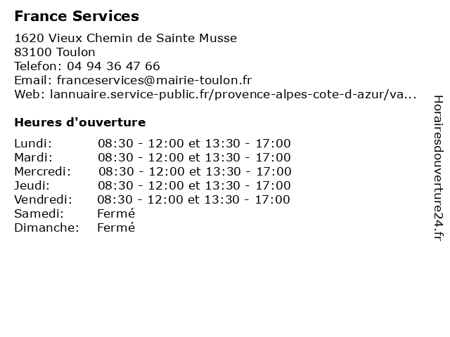 1 France Services (Distance: 9,19 km) 98 Avenue Louis-Pergaud, 83500 La Seyne-sur-Mer administration, communes, france, service, services, services publics 2 France Services (Distance: 16,88 km) 80 Chemin du Rouve, 83330 Le Beausset administration, communes, france, service, services, services publics 3 France Services (Distance: 17,74 km) 14 Route de Brignoles, 83136 Méounes-lès-Montrieux administration, communes, france, service, services, services publics 4 Centre National d’Information sur les Droits des Femmes et des Famille (Distance: 0,03 km) 1624 Chemin de Ste Musse, 83100 Toulon centre, des, droits, d’information, et, famille, femmes, les, national, publics, services, sur 5 Brasserie Le France (Distance: 0,68 km) 98 RN, 83160 La Valette du Var boutique, brasserie, femmes, france, hommes, le, mode, shopping, shopping center 6 Pompes Funèbres de France (Distance: 1,66 km) 25 Avenue du Char Verdun, 83160 La Valette-du-Var crémation, de, france, funèbres, funéraires, inhumation, philae, pompes, salons funéraires, services |