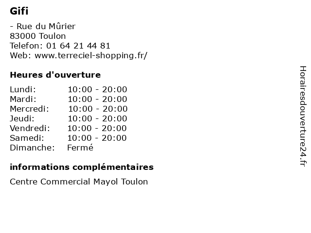 1 GiFi (Distance: 6,18 km) - Avenue de l'Université, 83160 La Valette-du-Var ameublement, déco, décoration, gifi, intérieur, maison, meubles 2 Gifi (Distance: 6,77 km) 346 avenue de londres, 83500 La seyne sur mer distribution, gifi, proche du hard-discount non-alimentaire, produits à petits prix pour la maison et la famille 3 GiFi (Distance: 14,29 km) - quartier Saint martin, 83400 Hyères bureau, cuisine, décoration, gifi, jardin & plein air, salle à manger, salon, stockage - salle 4 Aubert (Distance: 0,00 km) - Rue du Mûrier, 83000 Toulon aubert, beaute&sante, bijoux, chausures, decoration, mode enfants, mode femmes, mode hommes, optique, restaurant, sport 5 Chicken Spot (Distance: 0,00 km) - Rue du Mûrier, 83000 Toulon beaute&sante, bijoux, chausures, chicken, decoration, mode enfants, mode femmes, mode hommes, optique, restaurant, sport, spot 6 La Grande Récré (Distance: 0,00 km) - Rue du Mûrier, 83000 Toulon beaute&sante, bijoux, chausures, decoration, grande, la, mode enfants, mode femmes, mode hommes, optique, restaurant, récré, sport |