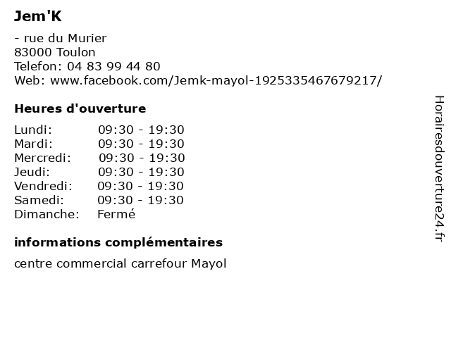 1 Jem (Distance: 13,63 km) . Chemin du Rocher Saint-Jean, 83400 Hyères azur, centre, commercial, hyeres, jem 3 André (Distance: 0,00 km) . Rue du Mûrier, 83000 Toulon accessoires, andré, chaussure, chaussures, mode 4 Burton (Distance: 0,00 km) . Rue du Mûrier, 83000 Toulon accessoires, bijoux, burton, chaussures, mode, vêtements 5 Celio (Distance: 0,00 km) - Rue du Murier, 83000 Toulon celio, hommes, magasin, mode, prêt à porter, vêtements 6 Icône Shop (Distance: 0,00 km) - Rue du Mûrier, 83000 Toulon accessoires, boutique, habiilements, icône, mode, shop, vêtements |
