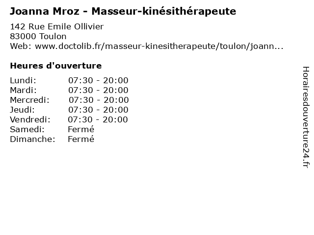 1 Joanna Marzuoli - Ostéopathe (Distance: 9,42 km) 1 Avenue Laennec, 83140 Six-Fours-les-Plages joanna, marzuoli, ostéo, ostéopathe, ostéopathes, soins 2 Maître Joanna Touati - Avocate (Distance: 50,16 km) 102 rue Grignan, 13001 Marseille avocate, avocats, civils, droits, joanna, juridiques, maître, touati 3 Anthony Spiteri - Masseur-kinésithérapeute (Distance: 0,00 km) 142 Rue Emile Ollivier, 83000 Toulon anthony, kiné, kinésithérapeute, masseur, rééducation, soin, spiteri 4 Daria Bondar - Masseur-kinésithérapeute (Distance: 0,00 km) 142 Rue Emile Ollivier, 83000 Toulon bondar, daria, kiné, kinésithérapeute, masseur, rééducation, soin 5 Caroline Antin - Masseur-kinésithérapeute (Distance: 0,02 km) 142 Rue Emile Ollivier, 83000 Toulon antin, caroline, docteur, kine, kinesitherapeute, kinésithérapeute, masseur 6 Yoann Monteil - Masseur-kinésithérapeute (Distance: 0,02 km) 142 Rue Emile Ollivier, 83000 Toulon docteur, kine, kinesitherapeute, kinésithérapeute, masseur, monteil, yoann |