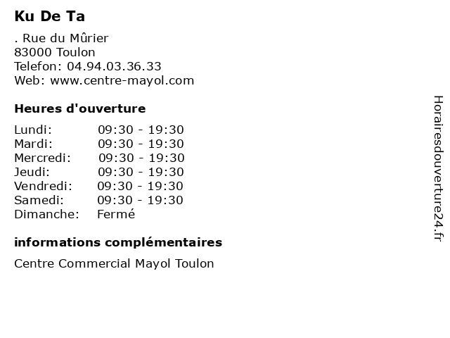 1 Le Kudeta (Distance: 0,06 km) - Place Besagne, 83100 Toulon brasserie, cuisine, ku, kudeta, le, repas, restaurants, ta 2 Restaurant Ta&Co (Distance: 47,56 km) 198 Boulevard Baille, 13005 Marseille boissons, les desserts, les repas, restaurant, ta&co, tacos 3 Ta&Co (Distance: 47,56 km) 198 Boulevard Baille, 13005 Marseille bar, bistro, bistrot, brasserie, café, pub, restaurant, restauration, resto, ta&co 5 Ta'a Tiki Tattoo - Studio privé (Distance: 48,77 km) 42 rue Stanislas Torens, 13006 Marseille boutiques, dessin, piercing, privé, studio, ta'a, tatouage, tattoo, tiki 6 Libère ta danse (Distance: 58,63 km) 348 Avenue Gaston Berger, 13090 AIX-EN-PROVENCE adulte, bien-être, brelot, confiance ensoi, danse, estime de soi, libère, lâcher prise, solange, ta, émotion |
