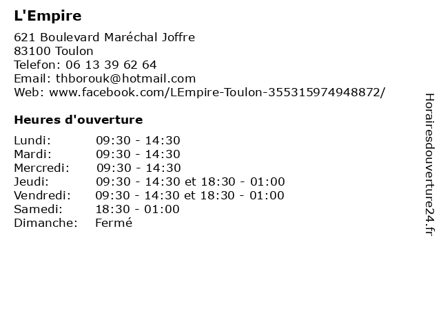| Jeudi | 09:30-14:30 et 18:30-01:00 |