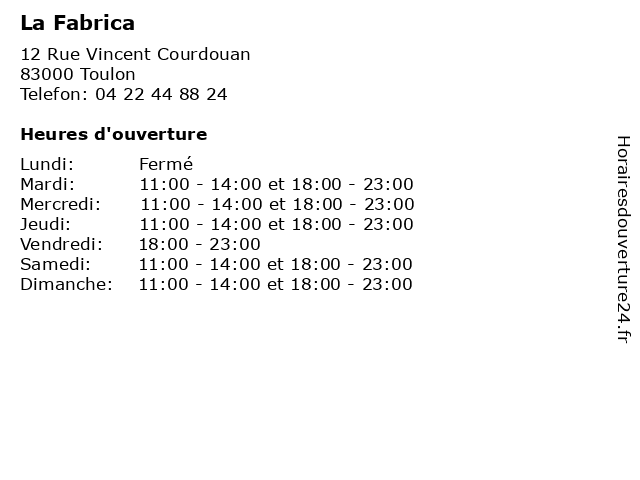 | Dimanche | 11:00-14:00 et 18:00-23:00 |