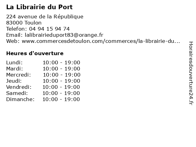 1 Poissonnerie du Port (Distance: 0,14 km) 2 Rue de la Fraternité, 83000 Toulon crustacés, du, magasin, poissonnerie, poissonneries, poissons, port 2 Librairie Brun (Distance: 0,46 km) 264 Rue Jean Jaurès, 83100 Toulon bd, brun, histoires, librairie, livres, poésies, roman 3 Librairie Charlemagne (Distance: 0,52 km) 50 boulevard de Strasbourg, 83000 Toulon agence, charlemagne, gestion, immobilier, librairie, location, transaction, vente 4 Librairie Musique Internationale Partitions (LMI) (Distance: 0,71 km) 238 Boulevard de Tessé, 83000 Toulon accompagnements, conseils, internationale, librairie, lmi, milliers de partitions, musique, partitions 5 Médiathèque du Port Marchand (Distance: 0,88 km) - Avenue de l'Armée d'Afrique, 83000 Toulon cd, du, dvd, livres, marchand, médiathèque, port, revues 6 Librairie Charlemagne (Distance: 4,51 km) 27 quai Gabriel Péri, 83500 La Seyne sur Mer charlemagne, librairie, livres |