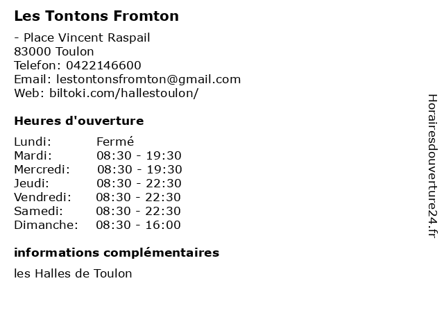 1 Epicerie Popol (Distance: 0,00 km) 1 Place Vincent Raspail, 83000 Toulon alimentation, apéro, charcuterie, epicerie, fine, fromage, popol, épicerie 2 Fromagerie Moreau Les Clarines (Distance: 0,06 km) 65 cours Lafayette, 83000 Toulon cantal, chèvre, clarines, fromage, fromagerie, gruyère, les, moreau 3 Fromagerie de La Garde-Horaires hors fêtes (Distance: 6,14 km) 9 Place de la République, 83130 La Garde de, fromagerie, fêtes, garde, horaires, hors, la, publics, services 4 Fromagerie de La Garde- Horaires pendant les fêtes (Distance: 6,14 km) 9 Place de la République, 83130 La Garde de, fromagerie, fêtes, garde, horaires, la, les, pendant, publics, services 5 La Reserve du Marechal (Distance: 8,62 km) 830 Avenue du Maréchal de Lattre-de-Tassigny, 83140 Six-Fours-Les-Plages du, fabrication de fromage, fromage, fromager, fromagerie, la, marechal, nourriture, reserve, vente 6 Carnivor (Distance: 9,61 km) s/n Quartier de l'Aubanne, 83210 La Farlede boucherie, carnivor, charcuterie, fromagerie |