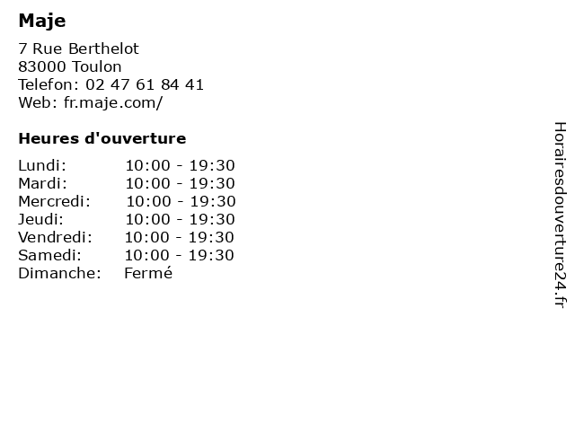 1 Maje (Distance: 5,58 km) . Avenue De L'Universite, 83160 La Valette chaussures, femme, maje, mode, pulls, sacs, vetements 2 Maje (Distance: 6,94 km) n/c Centre commercial Grand Var, 83160 La Valette Du Var chaussures, femme, maje, mode, pulls, sacs, vetements 4 Maje (Distance: 41,39 km) - chemin de la Sablière, 13011 Marseille accessoires, chaussures, habillement, maje, mode, vetement 5 Maje (Distance: 48,76 km) 27 Rue Grignan, 13006 Marseille accessoires, chaussures, femme, maje, mode, pulls, sacs, vetements 6 |