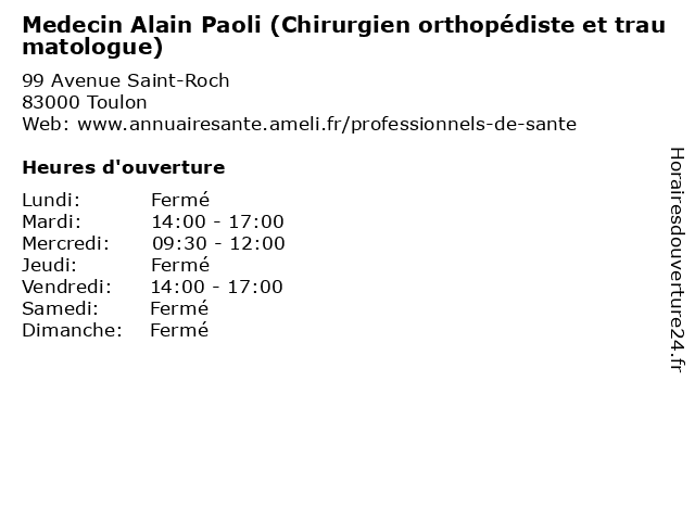 1 Medecin Alain Paoli - Horaires du Cabinet (Chirurgien orthopédiste et traumatologue) (Distance: 0,00 km) 99 Avenue Saint-Roch, 83000 Toulon alain, cabinet, chirurgien, docteur, du, et, horaires, medecin, orthopédiste, paoli, sante, services, traumatologue 2 Medecin Christian Thomas (Chirurgien orthopédiste et traumatologue) (Distance: 2,20 km) 525 Avenue François Cuzin, 83100 Toulon chirurgien, christian, docteur, et, medecin, orthopédiste, sante, services, thomas, traumatologue 3 Medecin Philippe Tchenio (Chirurgien orthopédiste et traumatologue) (Distance: 2,20 km) 525 Avenue François Cuzin, 83000 Toulon chirurgien, docteur, et, medecin, orthopédiste, philippe, sante, services, tchenio, traumatologue 4 Medecin Frederick Boudard (Chirurgien orthopédiste et traumatologue) (Distance: 2,20 km) 525 Avenue François Cuzin, 83000 Toulon boudard, chirurgien, docteur, et, frederick, medecin, orthopédiste, sante, services, traumatologue 5 Dr Grillo Jean-Charles - Chirurgien orthopédiste - secrétariat (Distance: 3,44 km) - Avenue Frédéric Mistral, 83190 Ollioules charles, chirurgien, consultation, docteur, dr, grillo, jean, med, médecin, médecine, orthopédiste, secrétariat, traitement 6 Dr Salvatore Sessa - Chirurgien orthopédiste - secrétariat (Distance: 3,44 km) - Avenue Frédéric Mistral, 83190 Ollioules chirurgien, consultation, docteur, dr, med, médecin, médecine, orthopédiste, salvatore, secrétariat, sessa, traitement |