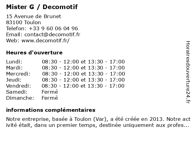 | Lundi | 08:30-12:00 et 13:30-17:00 |