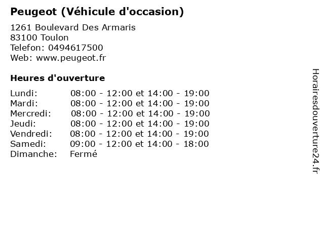 1 Peugeot (Véhicule d'occasion) (Distance: 5,48 km) . Avenue D'Estienne D'Orves, 83500 La Seyne Sur Mer automobiles, concéssionnaire, d'occasion, garage, motos, peugeot, véhicule 2 Peugeot (Véhicule d'occasion) (Distance: 11,42 km) . Rue Saint Joseph, 83400 Hyeres automobiles, concéssionnaire, d'occasion, garage, motos, peugeot, véhicule 3 Peugeot (Véhicule neuf) (Distance: 0,00 km) 1261 Boulevard Des Armaris, 83100 Toulon automobiles, concéssionnaire, garage, motos, neuf, peugeot, véhicule 4 Peugeot (Après vente) (Distance: 0,00 km) 1261 Boulevard Des Armaris, 83100 Toulon après, automobiles, concéssionnaire, garage, motos, peugeot, vente 5 Peugeot (Pièce de rechange) (Distance: 0,00 km) 1261 Boulevard Des Armaris, 83100 Toulon automobiles, concéssionnaire, de, garage, motos, peugeot, pièce, rechange 6 Renault Retail Group (Véhicule d'Occasion) (Distance: 1,79 km) . Avenue Lavoisier, 83160 La Valette du Var automobiles, d'occasion, garage, group, motos - concessionnaire, renault, retail, véhicule |