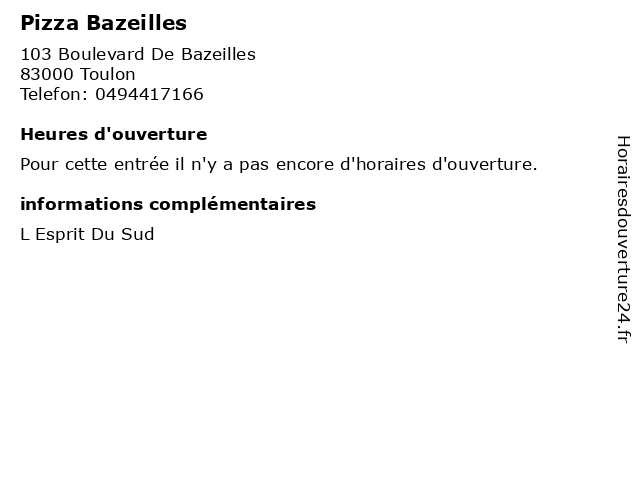 1 Auchan Piéton Toulon Bazeilles (Distance: 0,01 km) 113 Boulevard Bazeilles, 83000 TOULON auchan, bazeilles, piéton, toulon 2 Casa Pizza (Distance: 0,59 km) 21 Avenue de l'Infanterie de Marine, 83000 Toulon café, casa, italien, pizza, pizzas, pizzeria, restaurant, restauration 3 Pizza Tel (Distance: 0,59 km) 21 Avenue de l'Infanterie de Marine, 83000 Toulon nestor, pizza, rapide, restaurants, tel 4 Pizza Milano (Distance: 0,86 km) 132 Avenue Claude Farrère, 83000 Toulon commandes, milano, pizza, pizzeria, restaurants 5 Safari Pizza (Distance: 0,97 km) 163 Rue Jean Bartolini, 83000 Toulon bar, café, christian, duc, pizza, restaurants, safari 6 Koko Pizza (Distance: 1,05 km) 51 avenue François Cuzin, 83000 Toulon boissons, koko, menus, pizza, pizzeria, restaurant  |