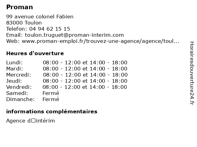 1 Proman (Distance: 1,79 km) 432 Boulevard Maréchal Foch, 83000 Toulon agence, d'intérim, emplois, proman 2 Proman (Distance: 9,15 km) 575 Avenue Alphonse Lavalée, 83210 La Farlède agence, cdd, d'intérim, proman, travail 3 Réseau Entreprendre Var (Distance: 0,21 km) - Place Georges Pompidou, 83000 Toulon création, emplois, employeurs, entreprendre, réseau, var 4 Paierie départementale - Var (Distance: 0,47 km) 40 traverse des Minimes, 83051 Toulon administration, association, déclarations, départementale, emplois, employeurs, paierie, travails, var 5 Interaction Intérim (Distance: 0,54 km) 447 avenue Franklin Roosevelt, 83000 Toulon agence, emplois, interaction, intérim, job, professionnelle, qualifications, recherche 6 Welljob Toulon (Distance: 0,57 km) 7 Boulevard Léon Bourgeois, 83100 Toulon agence d'intérim, besoins, cdd, cdi intérimaire, contrat, emplois, entreprises, formation, français, gestion, intérim, placement, recrutement, ressources humaines, rh, secteurs d'activité, solutions, toulon, travail temporaire, welljob |