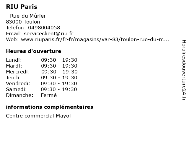 1 Jacqueline Riu (Distance: 0,01 km) . Rue du Mûrier, 83000 Toulon cafe, chaussures, homme, jacqueline, mode femme, restaurant, riu 2 Gossip Paris (Distance: 0,30 km) 4 Rue Hoche, 83000 Toulon accessoires, divers, gossip, habillement, magasins, paris, star, top 3 Dr Bruno Paris - Chirurgien-dentiste (Distance: 0,34 km) 11 Rue Berthelot, 83000 Toulon actes et symptômes, bruno, chirurgien, chirurgien-dentiste, dentiste, dr, expertises, medical, paris 4 Maître Laurent Paris - Avocat (Distance: 1,62 km) 664 avenue Maréchal Foch, 83000 Toulon avocat, avocats, civils, droits, juridiques, laurent, maître, paris 5 AS Autosécurité Contrôle Technique TOULON - BOULEVARD PARIS (Distance: 2,21 km) 69 Bd de paris, 83200 TOULON as, autosécurité, boulevard, contrôle, paris, technique, toulon 6 Project X Paris (Distance: 6,08 km) 300 Avenue de l'université, 83160 La Valette du Var accessoires, boutique, mode, paris, project, prêt à porter, vêtements |