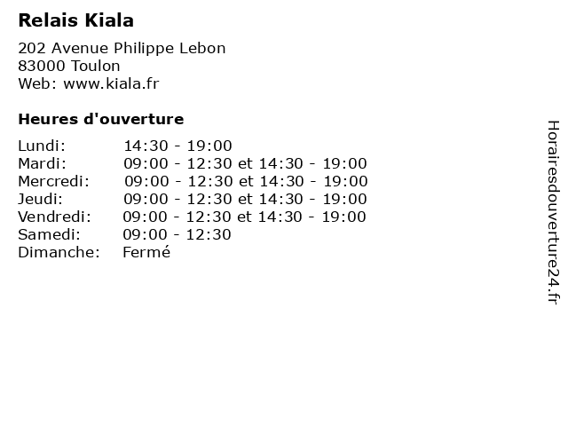 1 Relais Kiala (Distance: 0,30 km) 16 Avenue François Cuzin, 83000 Toulon kiala, relais, services postaux et de livraison 2 Relais Kiala (Distance: 0,87 km) 121 Avenue de la République, 83000 Toulon kiala, relais, services postaux et de livraison 3 Relais Kiala (Distance: 0,97 km) 21 Rue Mirabeau, 83000 Toulon kiala, relais, services postaux et de livraison 4 Relais Kiala (Distance: 2,12 km) 7 Place Martin Bidoure, 83200 Toulon kiala, relais, services postaux et de livraison 5 Relais Kiala (Distance: 2,25 km) 353 Avenue de Forbin, 83100 Toulon kiala, relais, services postaux et de livraison 6 Relais Kiala (Distance: 3,30 km) 21 Avenue Mirasouléou, 83160 La Valette-du-Var kiala, relais, services postaux et de livraison |