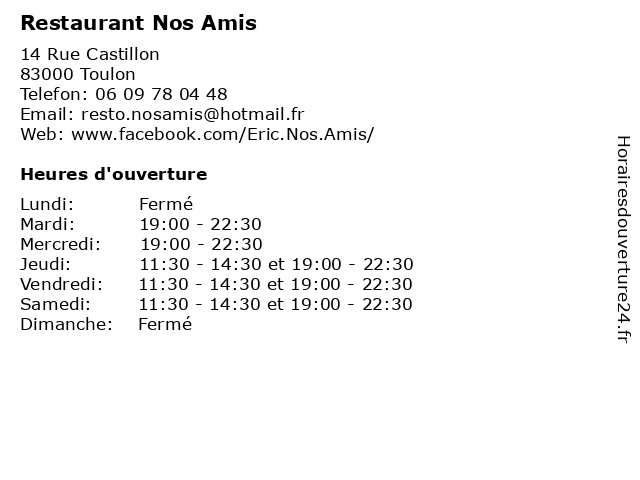| Vendredi | 11:30-14:30 et 19:00-22:30 |