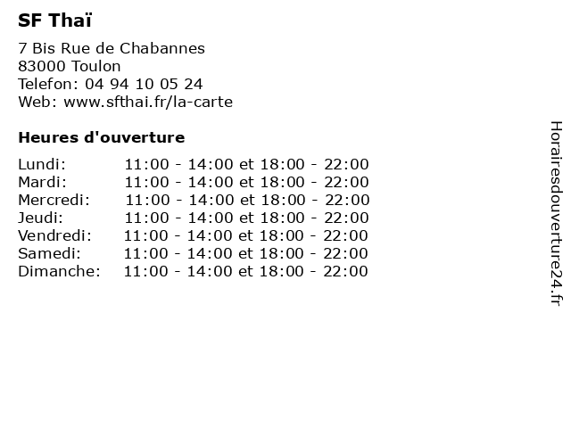 | Jeudi | 11:00-14:00 et 18:00-22:00 |