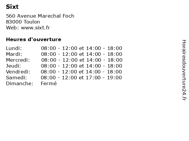 1 Sixt (Distance: 0,37 km) - Place de l'Europe, 83000 Toulon location de voitures, location longue durée, sixt, voiture, véhicules 2 Sixt (Distance: 19,00 km) - Boulevard Marine, 83400 Hyeres location de voitures, location longue durée, sixt, voiture, véhicules 3 Sixt location voiture Toulon Gare (Distance: 0,40 km) , 83000 Toulon gare, location, service de chauffeurs, service de navette aéroport, sixt, toulon, voiture 4 Sixt Toulon - La Valette du Var - CLOSED (Distance: 5,93 km) 37 Avenue Des Frères Lumière, 83160 La Valette-du-Var, Toulon agence de location de camionnettes, agence de location de camions, closed, du, la, service de chauffeurs, service de navette aéroport, sixt, toulon, valette, var 5 SIXT | Location voiture Hyères aéroport Toulon (Distance: 19,27 km) Boulevard Marine, 83400 Hyeres aéroport, hyères, location, service de chauffeurs, service de navette aéroport, sixt, toulon, voiture 6 Onepark / Gare SNCF Louis Armand (Longue Durée) Parking (Distance: 0,33 km) - Boulevard Pierre Toesca, 83000 Toulon armand, durée, gare, longue, louis, onepark, parking, services, sncf |