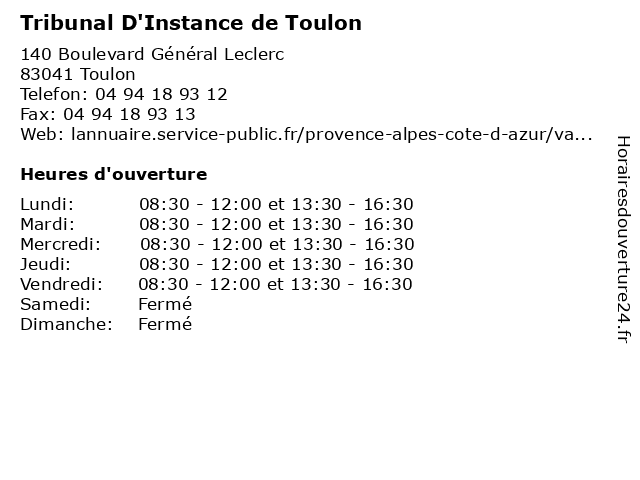1 Tribunal Judiciaire (Distance: 0,21 km) - Place Gabriel Péri, 83000 Toulon accusation, aix, appel, cour, défense, judiciaire, provence, tribunal 2 Greffe de Tribunal (Distance: 7,51 km) 140 Boulevard Maréchal Leclerc, 83041 Toulon de, greffe, publics, services, tribunal 3 Greffe de Tribunal - (Horaires d'Ouvertures de I'Accueil Telephonique ) (Distance: 7,51 km) 140 Boulevard Maréchal Leclerc, 83041 Toulon d'ouvertures, de, greffe, horaires, i'accueil, publics, services, telephonique, tribunal 4 Tribunal d'Instance (Distance: 33,61 km) . avenue de Verdun, 13400 Aubagne administration, d'instance, instance, service, tribunal 5 Tribunal d'Instance (Distance: 34,22 km) 174 route du Val, 83170 Brignoles administration, assoc, brignoles, d'instance, de, services, services publics, tribunal 6 Tribunal D'Instance (Distance: 48,30 km) . place Monthyon, 13281 Marseille administration, assoc, d'instance, services, services publics, tribunal |