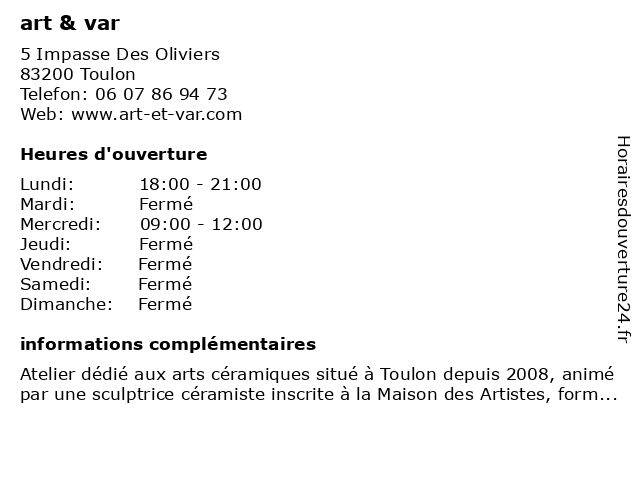 1 Art Déco Paysage (Distance: 1,91 km) 514 Ancien Chemin Revest À Valette, 83160 La Valette-du-Var art, déco, paysage 2 Trésorerie hospitalière du Var (Distance: 2,68 km) 54 rue Sainte-Claire-Deville, 83056 Toulon administration, chi, de, du, finances, hospitalière, impots, la, mer, public, service, seyne, sur, toulon, tresor, tresorerie, trésorerie, var 4 Atelier d'Art Floral la Rose de Cèdre-: Le 1er et 3ème vendredi (Distance: 3,48 km) 16 Allée des Baguiers, 83130 La Garde 1er, 3ème, atelier, cèdre, d'art, de, et, floral, la, le, public, rose, services, vendredi 5 L'Art Floral (Distance: 3,75 km) 364 Boulevard Enseigne de Vaisseau Guès, 83000 Toulon art, détail, floral, jardinage, l'art, magasins, pépinières, vente 6 Marché Nocturne Art' & Bien-être à Toulon (Distance: 4,48 km) . Des Pins, 83000 Toulon art', bien, frutas, hortalizas, marché, mercado, nocturne, toulon, verduras, être |